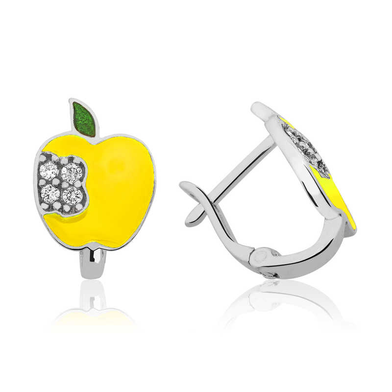 En kıymetlileriniz, bebekleriniz, çocuklarınız için hazırlanan, sevimli figürlerle tasarlanan birbirinden zarif ve renkli bebek ve çocuk küpeleri ile ömür boyu saklanabilecek, anlamlı bir hediye seçebilirsiniz. Sarı elma figürlü çocuk küpesi 925 ayar gümüşten imal edilmiştir. Gümüş üzerine rodyum kaplama yapılmıştır. Rodyum kaplama yapılan gümüş çocuk küpeleri parlaklığını uzun süre muhafaza eder ve oksitlenmesi gecikir. Küpe üzerinde bulunan taşlar zirkon'dur. Tüm çocuk küpe modelleri el emeği ile üretilmiştir. Gümüş ve değerli taşlar nedeniyle belirtilen ortalama ürün ağırlığında ± %10 sapma olabilmektedir.