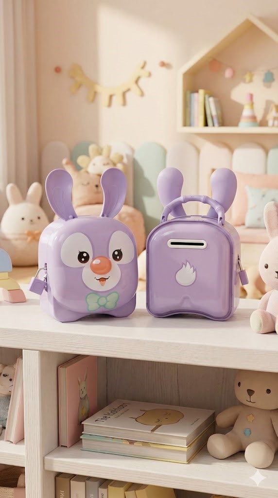 • Eğlenceli Çanta Tasarımı: Sırt çantası/valiz formundaki yapısı ve taşıma sapı sayesinde çocuklar kumbaralarını istedikleri yere kolayca götürebilirler.