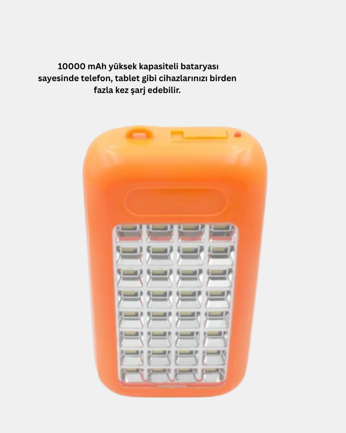 Üzerindeki 32 LED’li süper parlak aydınlatma paneli, kamp alanlarında, doğa yürüyüşlerinde veya elektrik kesintilerinde geniş alanları rahatlıkla aydınlatır. Çift USB portu, aynı anda iki cihazı şarj etmenize olanak tanır. Suya dayanıklı ve sağlam tasarımı, dış mekânlarda güvenli kullanım sağlar.