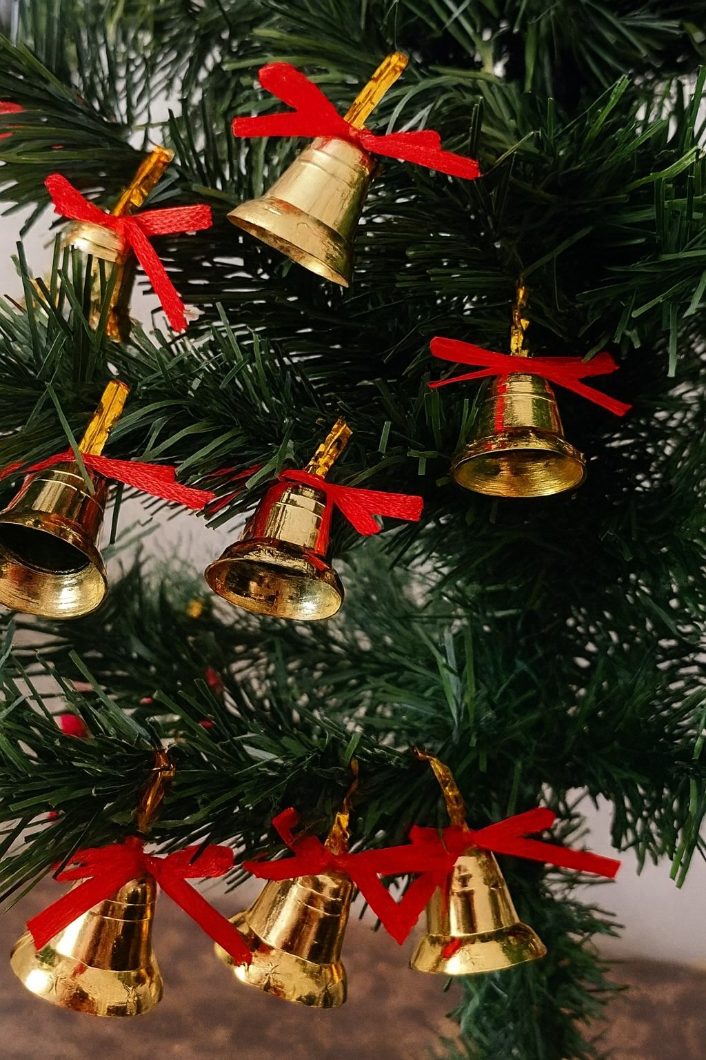 12 Adet Mini Çan Yılbaşı Çam Ağacı Süsü 3 cm Kırmızı Kurdeleli Gold Yılbaşı Çam Ağacı Süsü