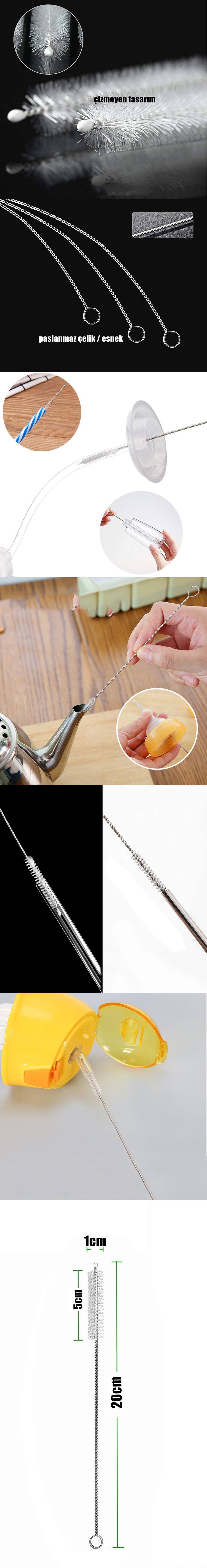 MALZEME: 304 Paslanmaz Çelik Telden ve dayanıklı yumuşak Uzun Naylon Kıllardan yapılmıştır. Yeniden kullanılabilir ve esnek temizleme fırçası araçları, neredeyse tüm pipetler, şişe ağzı, dökücüler, küçük huniler veya diğer boru şeklindeki öğeler için mükemmeldir.