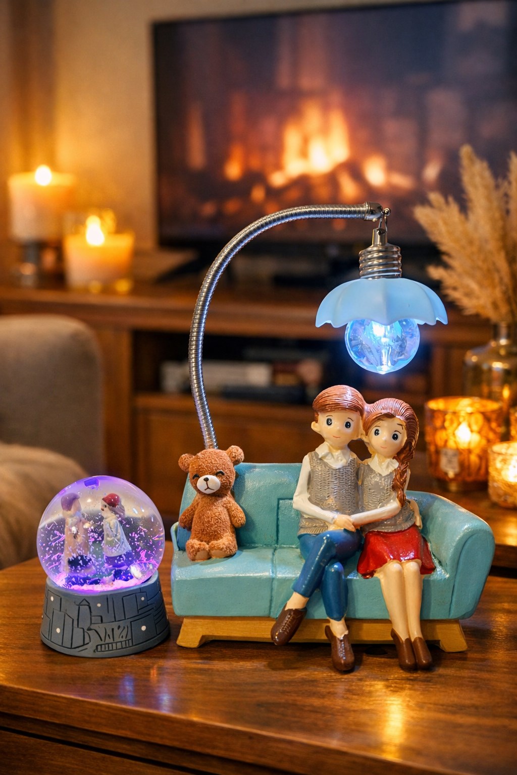 Sevimli çift figürü, kanepe detayları ve ayarlanabilir lambasıyla “birlikte geçirilen huzurlu akşamları” simgeler. Akşam saatlerinde loş bir ortam oluşturarak dinlendirici ve romantik bir ambiyans sağlar. Polyester malzemeden yapılmıştır, el boyamasıdır.