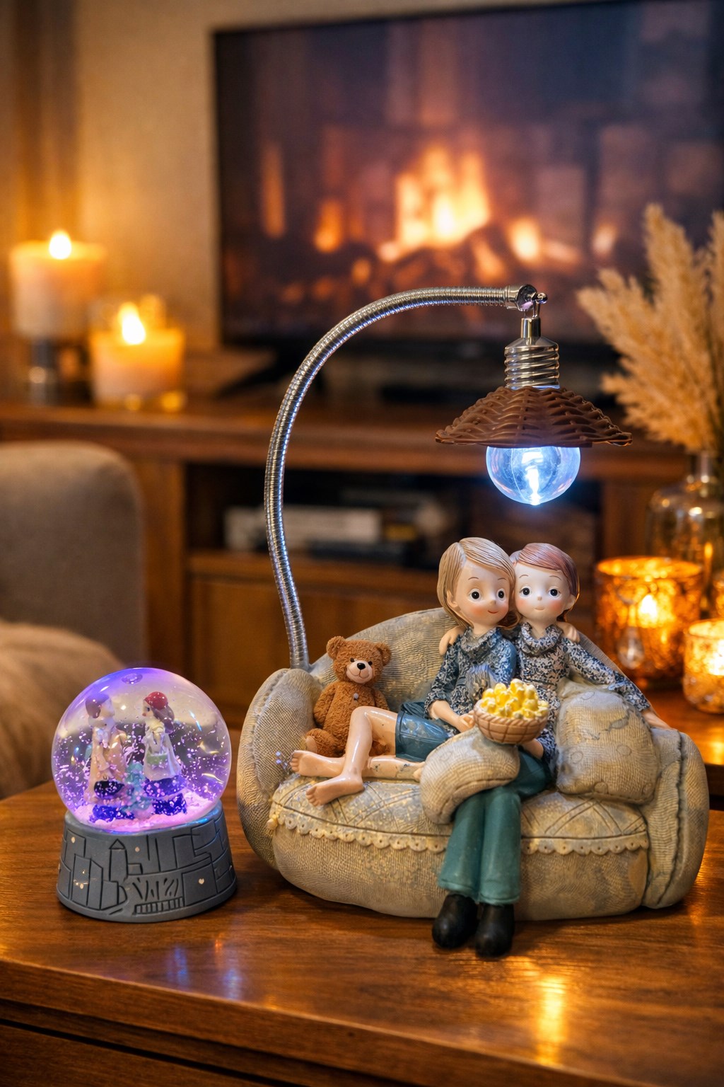 Film gecesi temalı çift figürü, yumuşak LED ışığıyla özellikle komodin ve yan sehpa üzerinde gece lambası olarak ideal bir kullanım sunar.