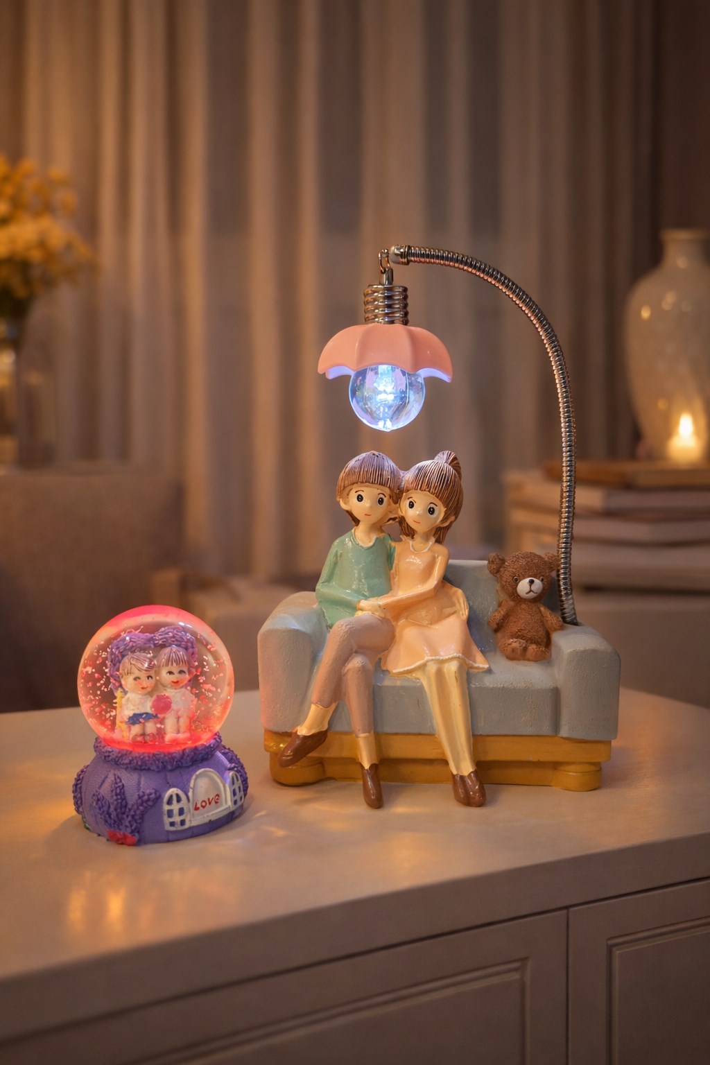 Sevimli çift figürü, kanepe detayları ve ayarlanabilir lambasıyla “birlikte geçirilen huzurlu akşamları” simgeler. Akşam saatlerinde loş bir ortam oluşturarak dinlendirici ve romantik bir ambiyans sağlar. Polyester malzemeden yapılmıştır, el boyamasıdır.