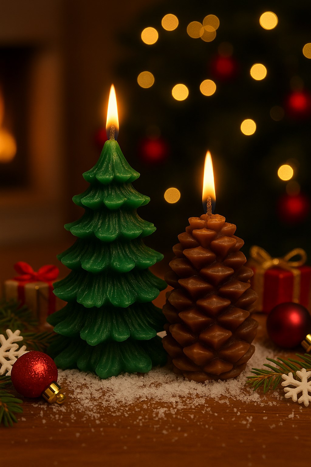 Set İçeriği: 1 adet çam ağacı şeklinde mum (13 cm) + 1 adet kozalak şeklinde mum (10 cm)
