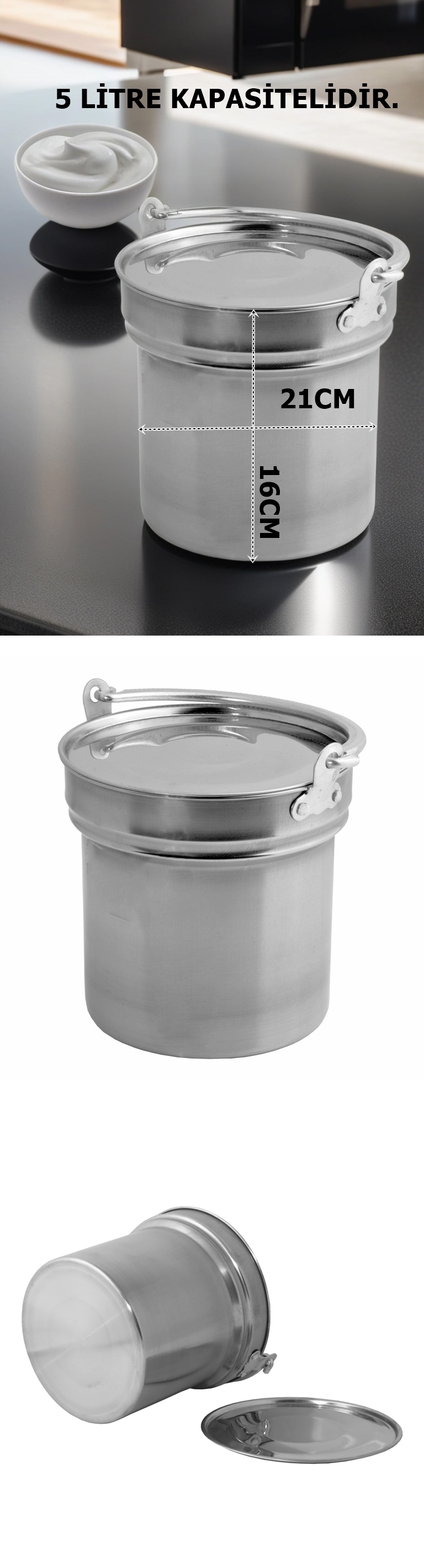 Bu 5 litrelik paslanmaz çelik yoğurt bakracı, geleneksel yöntemle yoğurt yapmak isteyenler için ideal. Gıdaya uygun çelik yapısı sayesinde sütü hijyenik şekilde muhafaza eder, ısıyı dengeli tutar ve yoğurt mayalama sürecini kolaylaştırır. Kilitli kapak sistemiyle hem sızdırmaz hem güvenli.