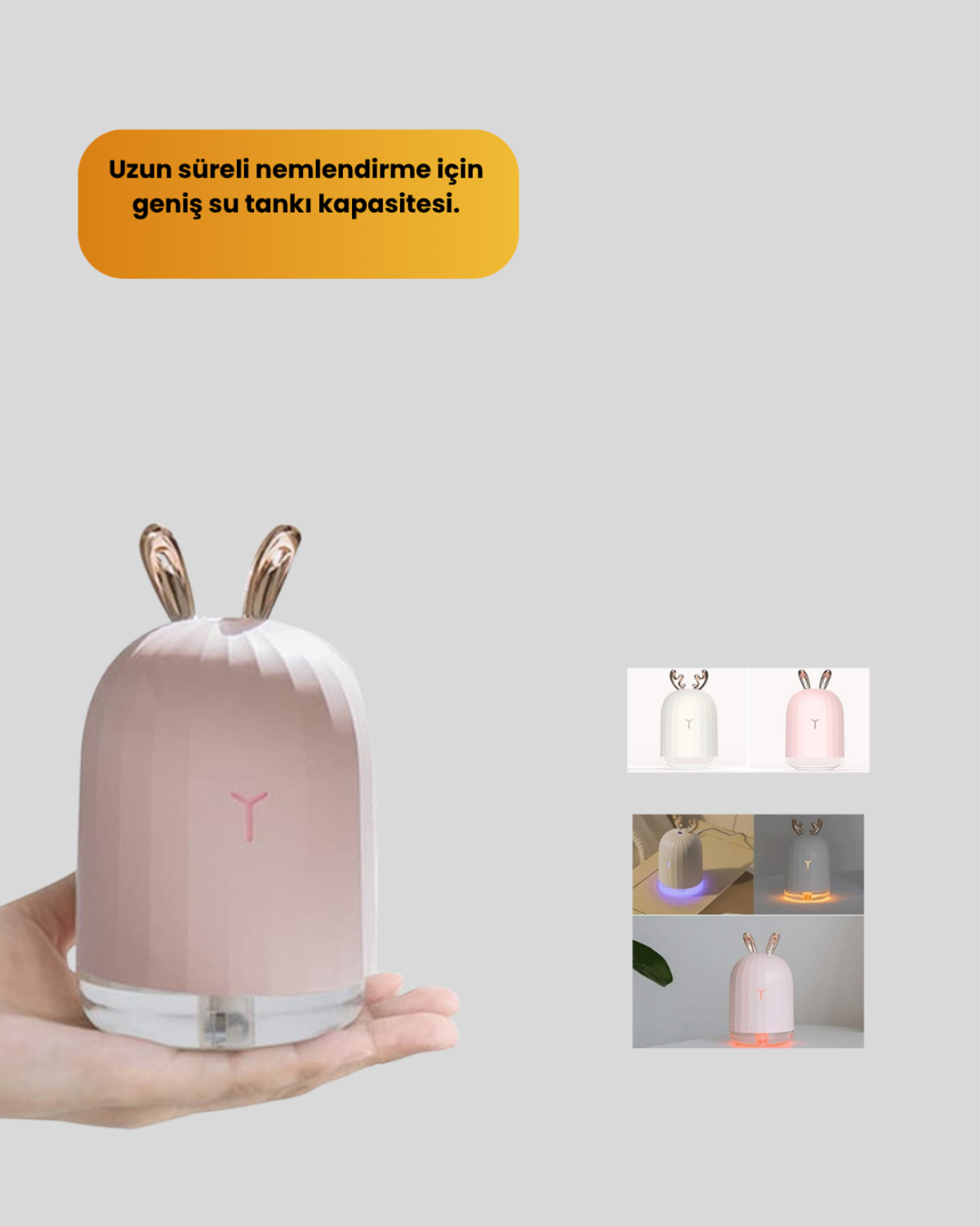 Cihaz, birkaç damla esansiyel yağ ile aroma difüzör olarak da çalışabilir ve bulunduğunuz ortama taze bir koku yayar. LED aydınlatma özelliği çok renkli olup istenildiğinde gece lambası olarak kullanılabilir. Sevimli tavşan kulaklı görünümüyle çocuk odalarına renk katar. USB bağlantısı ile kolayca çalıştırılabilir ve taşınabilirliği sayesinde ev, ofis ya da seyahat kullanımına uygundur. Su seviyesi göstergesi, kullanıcıya pratiklik sağlar. Kompakt ve hafif yapısıyla yer kaplamaz, dilediğiniz yere şıklık ve ferahlık taşır.