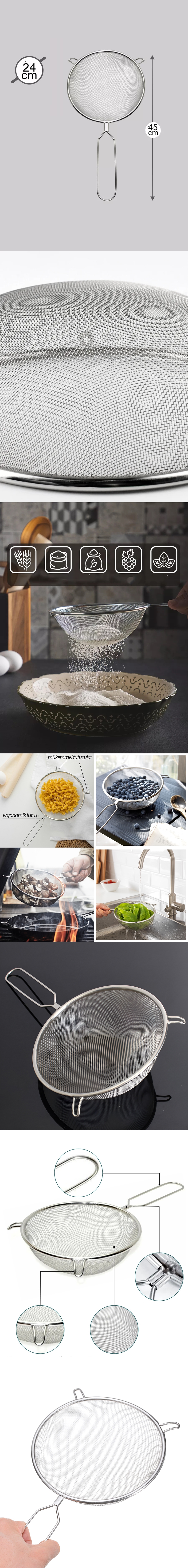 Eleyin, süzün ve durulayın: Un, şeker ve baharat gibi kuru malzemelerdeki yabancı maddeleri elemek ve filtrelemek ve kümeleri parçalamak için mükemmeldir. Bunları ayrıca meyve ve sebzeleri veya kinoa, pirinç ve orzo gibi ince tahılları ve makarnaları durulamak için kullanın. Soslar, topaklı sos ve yoğurt gibi kalın veya ince ıslak malzemeleri veya sıkılmış meyve sularından tohumları çıkarmak için de uygundur.