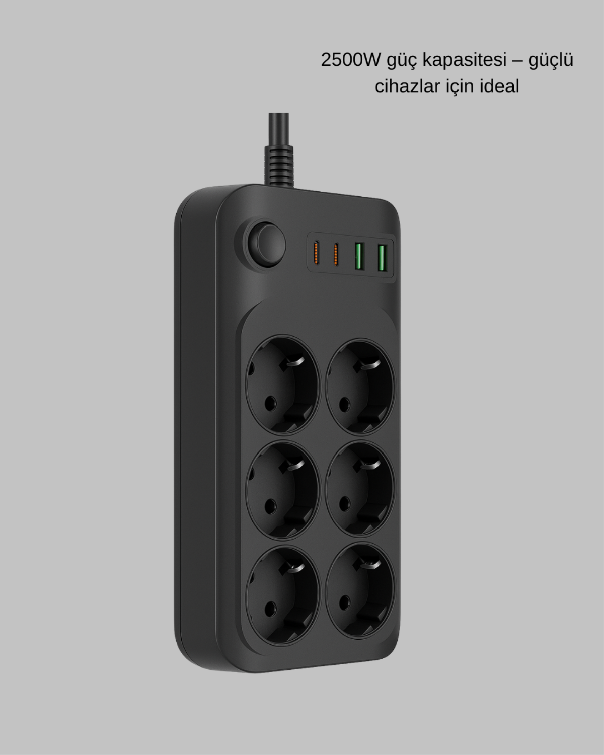 2500W Güçlü 6’lı Priz USB ve Type-C Çıkışlı Termal Korumalı