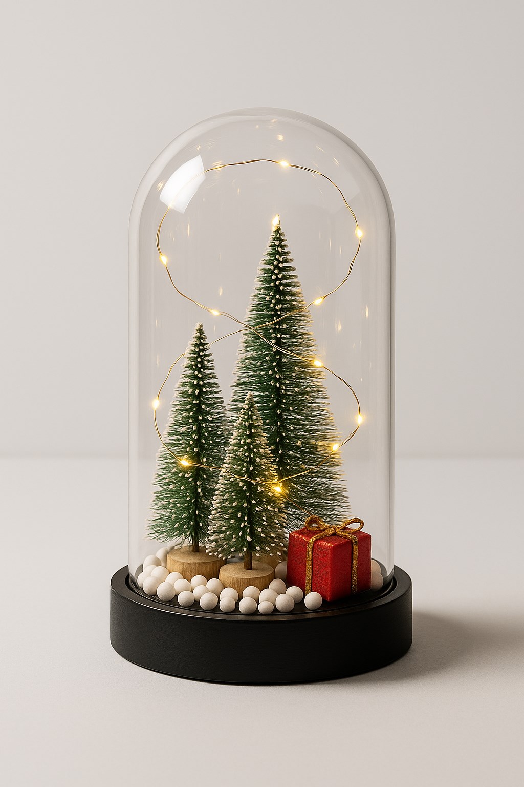 Sıcak sarı LED ışıklarıyla parlayan bu mini çam ağacı fanus, ev dekorasyonuna büyüleyici bir dokunuş katıyor. Şeffaf cam kubbe içinde yer alan kar efektli iki adet çam ağacı ve alt kısmındaki küçük hediye kutusu, kış mevsiminin sıcak atmosferini evinize taşıyor.