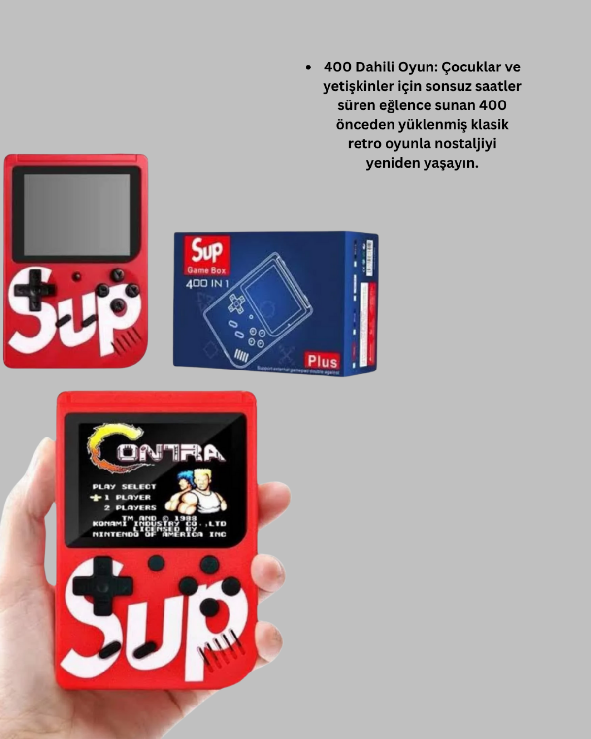 Eski oyunları modern formda yaşamak isteyenler için mükemmel bir cihaz! 400 klasik oyunu içinde barındıran bu mini retro oyun konsolu, çocuklar kadar yetişkinlerin de ilgisini çekecek. Kompakt boyutları sayesinde kolayca taşınabilir ve her ortamda kullanılabilir. Şarj edilebilir bataryası sayesinde ekstra pil ihtiyacı duymadan uzun süreli kullanım sağlar. 3 inç HD ekranıyla net görüntüler sunarken, sade kontrol yapısı sayesinde tüm kullanıcılar için kolaylık sağlar. Televizyona bağlanabilir özelliği sayesinde daha büyük ekranlarda arkadaşlarınızla nostaljik oyun keyfi yaşayabilirsiniz. ABS plastik gövdesi darbelere karşı dayanıklıdır ve çocuk kullanımına uygundur.