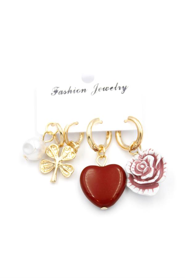 3'lü Kalp Çiçek Küpe - Kırmızı