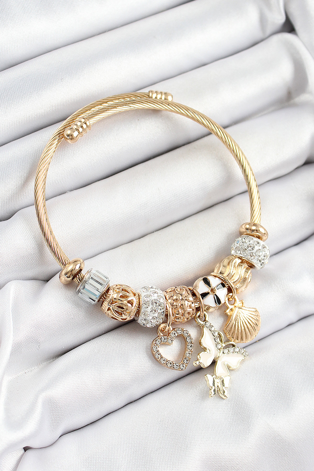316L Çelik Beyaz Zirkon Taşlı Kalp Kelebek Ve İstiridye Model Gold Renk Charm Bileklik - TJ-BB7308