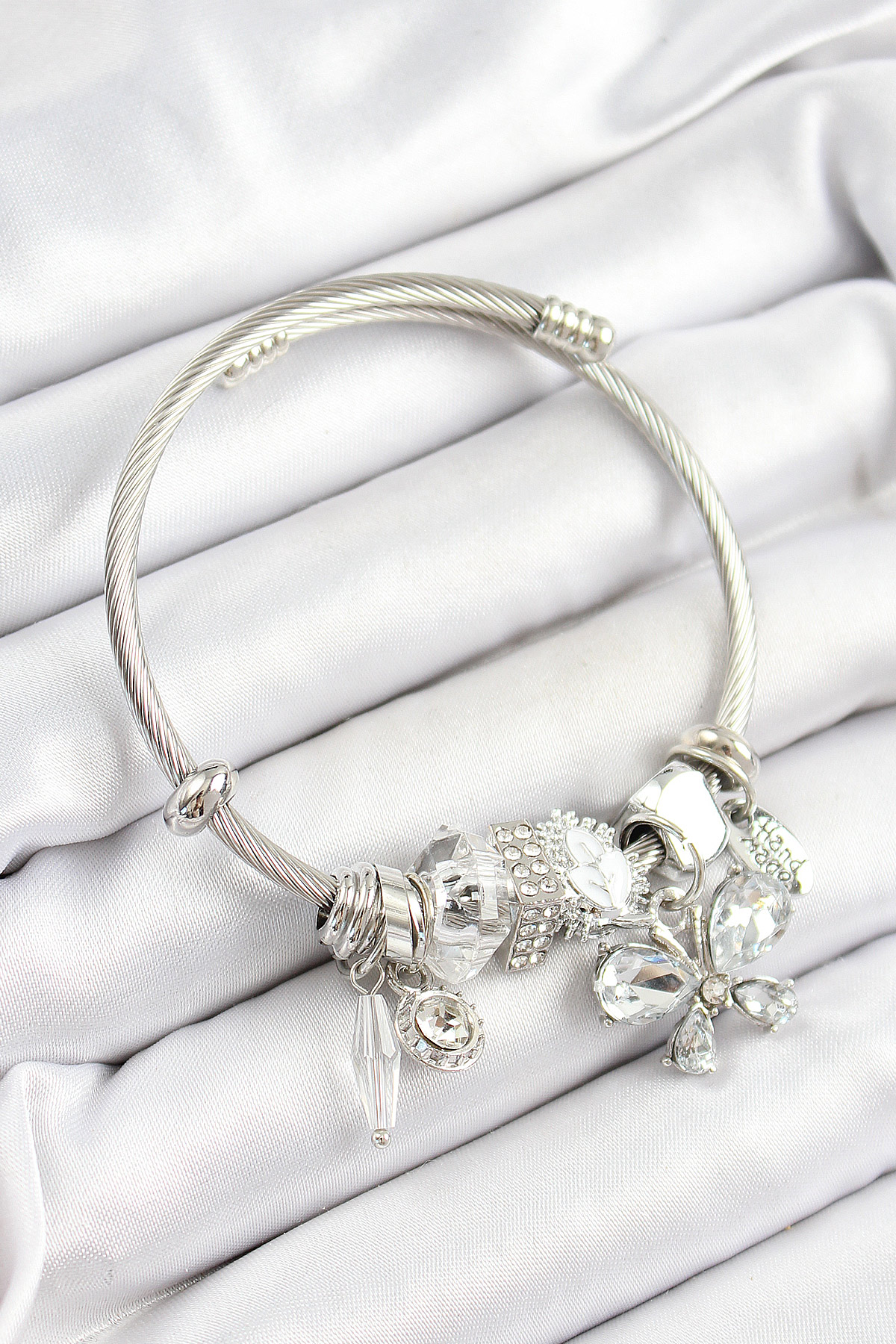 316L Çelik Beyaz Zirkon Taşlı Kelebek Model Gümüş Renk Charm Bileklik - TJ-BB7249