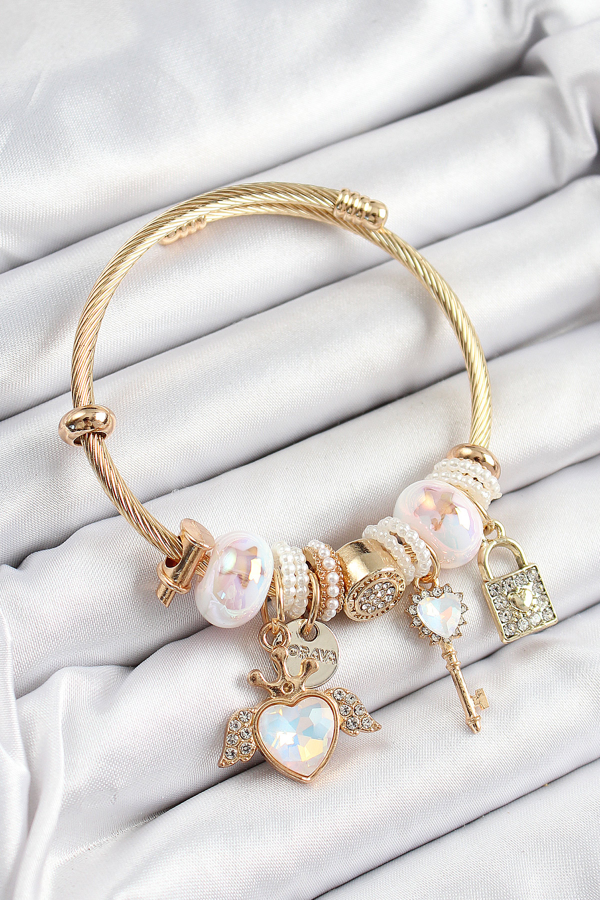 316L Çelik Beyaz Zirkon Taşlı Kilit Anahtar Ve Kalp Model Gold Renk Charm Bileklik - TJ-BB7295