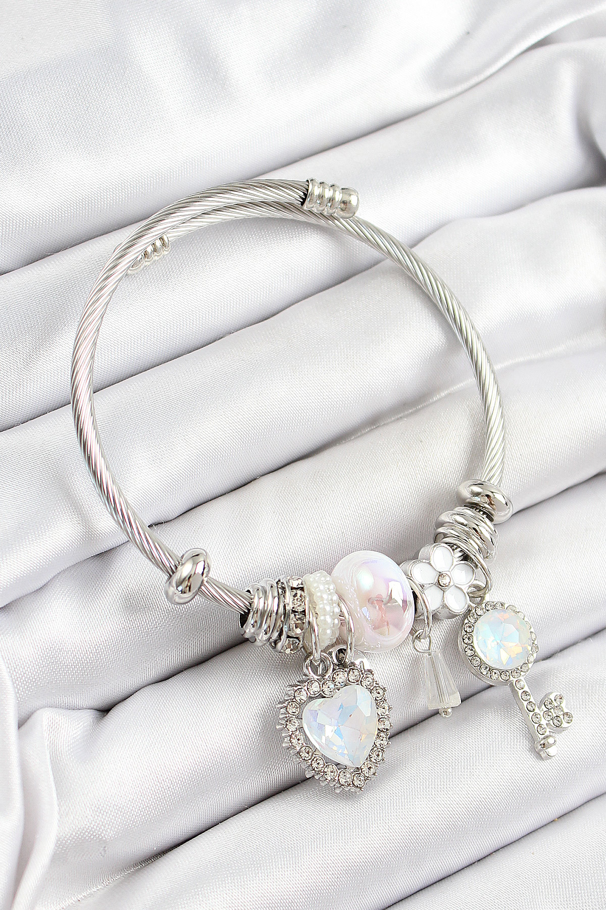 316L Çelik Beyaz Zirkon Taşlı Yıldız Anahtar Ve Kalp Model Gümüş Renk Charm Bileklik - TJ-BB7275