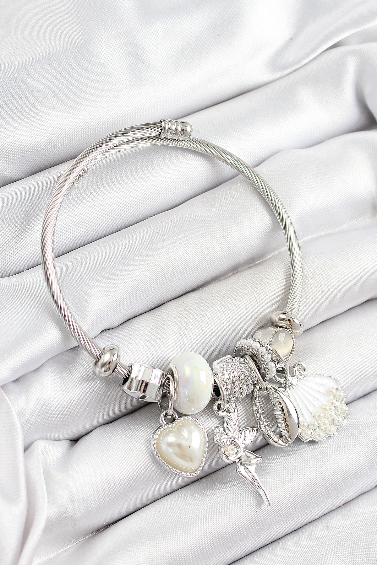 316L Çelik Beyaz Zirkon Taşlı Yıldız Melek İstiridye Ve Kalp Model Gümüş Renk Charm Bileklik - TJ-BB7279
