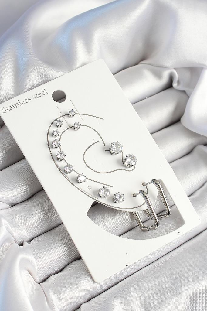 316L Çelik Dikdörtgen Figürlü Ve Zirkon Taşlı Gümüş Renk 7'li Çift Kadın Küpe Set - BKP10638