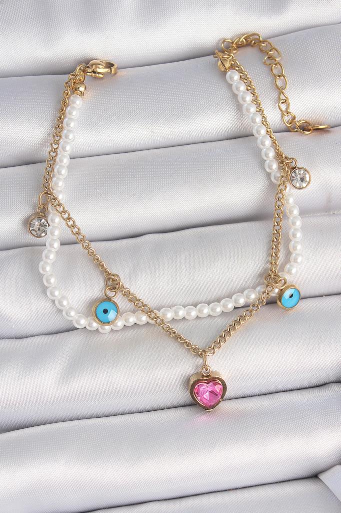 316L Çelik Gold Renk 2'Li İncili Zincir Sallantı Pembe Kalp Model Nazar Boncuk Detay Kadın Bileklik - BB6949