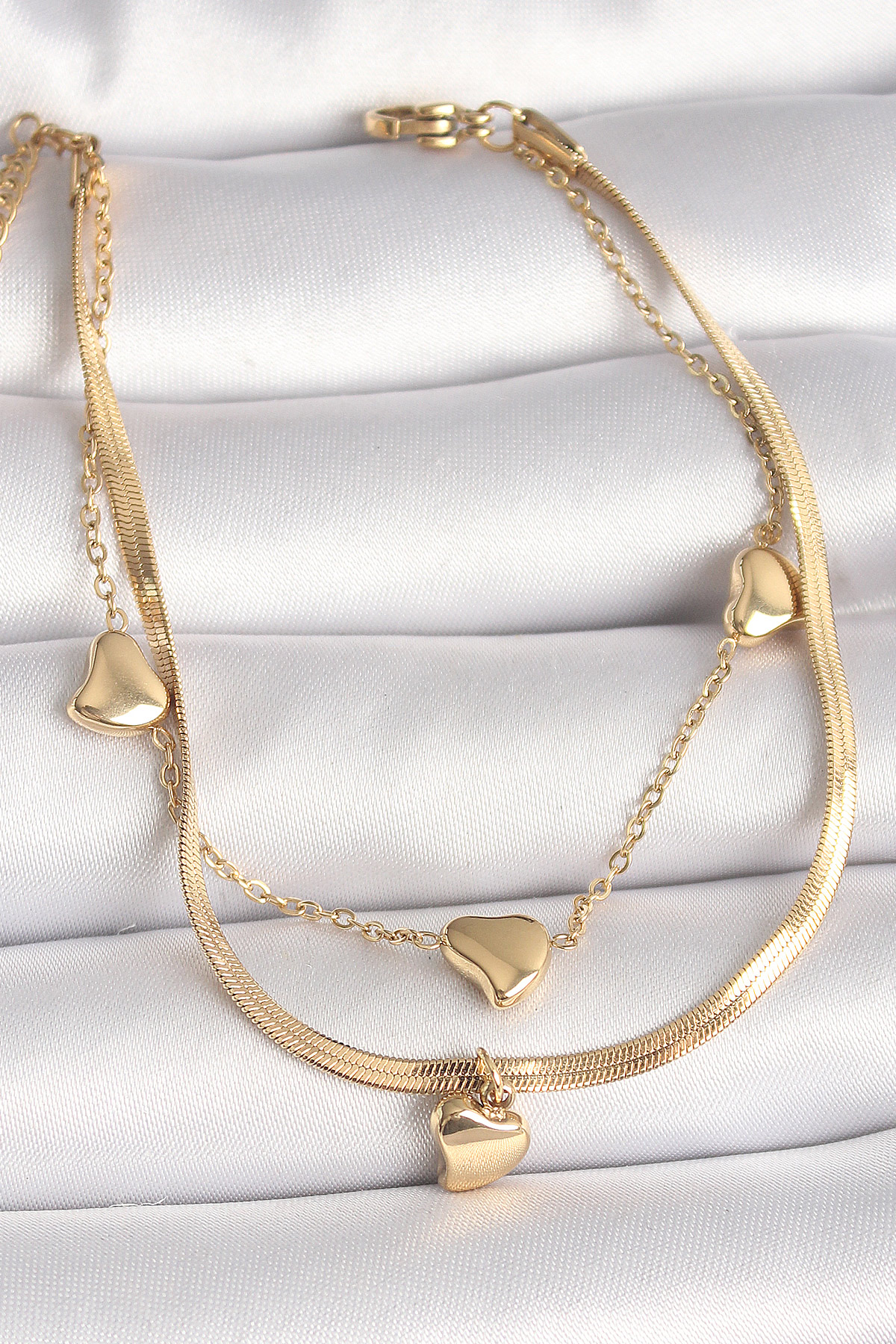 316L Çelik Gold Renk 2'Li İtalyan Zincir Sallantı Kalp Figür Kadın Bileklik - TJ-BB6766