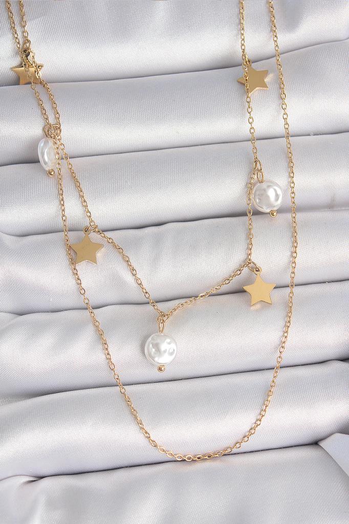 316L Çelik Gold Renk 2'Li Zincir Sallantı Yıldız İnci Model Kadın Kolye - BKO10110