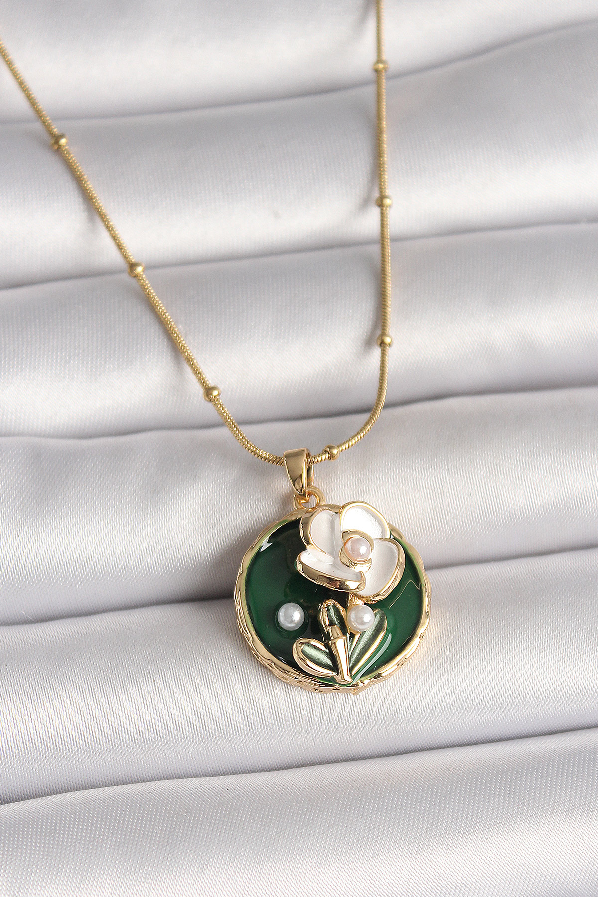 316L Çelik Gold Renk Beyaz Çiçek İşlemeli İnci Detaylı Yeşil Portre Model Kadın Kolye - TJ-BKO10023