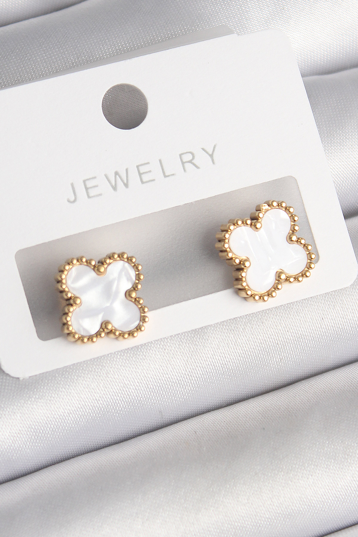 316L Çelik Gold Renk Beyaz Minelik Yonca Model Kadın Küpe - TJ-BKP10197