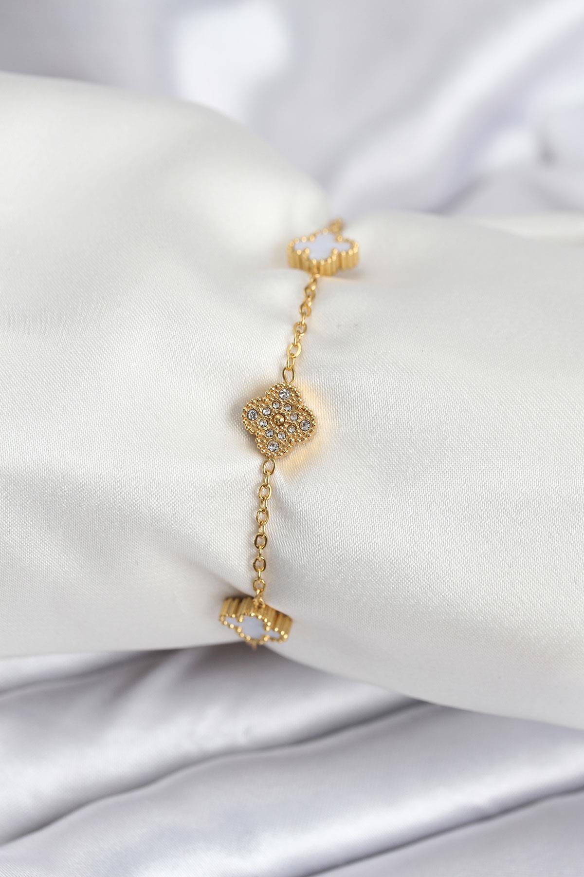 316L Çelik Gold Renk Beyaz ve Zirkon Taşlı Baby Boy Yonca Kadın Bileklik - TJ-BB7955