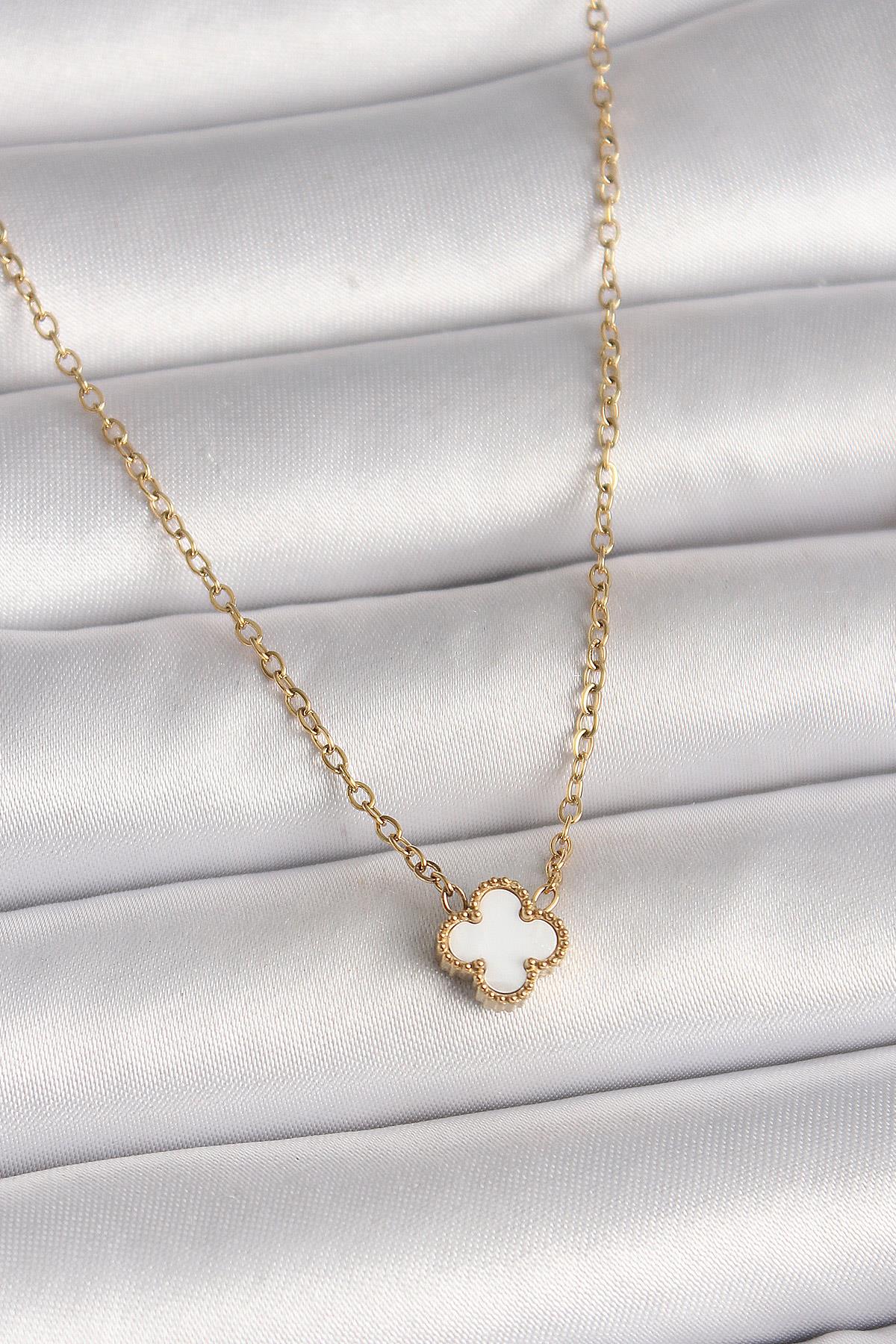 316L Çelik Gold Renk Beyaz Yonca Model Kadın Kolye - TJ-BKO10019