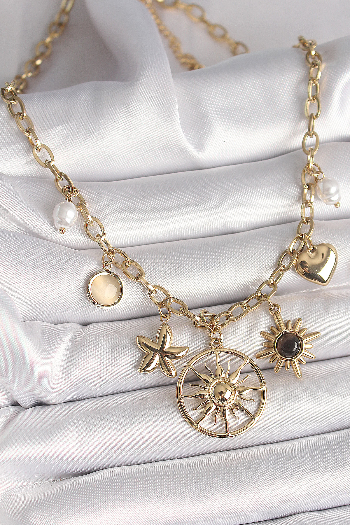 316L Çelik Gold Renk Güneş Model Siyah Mineli Güneş Detay Kadın Kolye - TJ-BKO9914