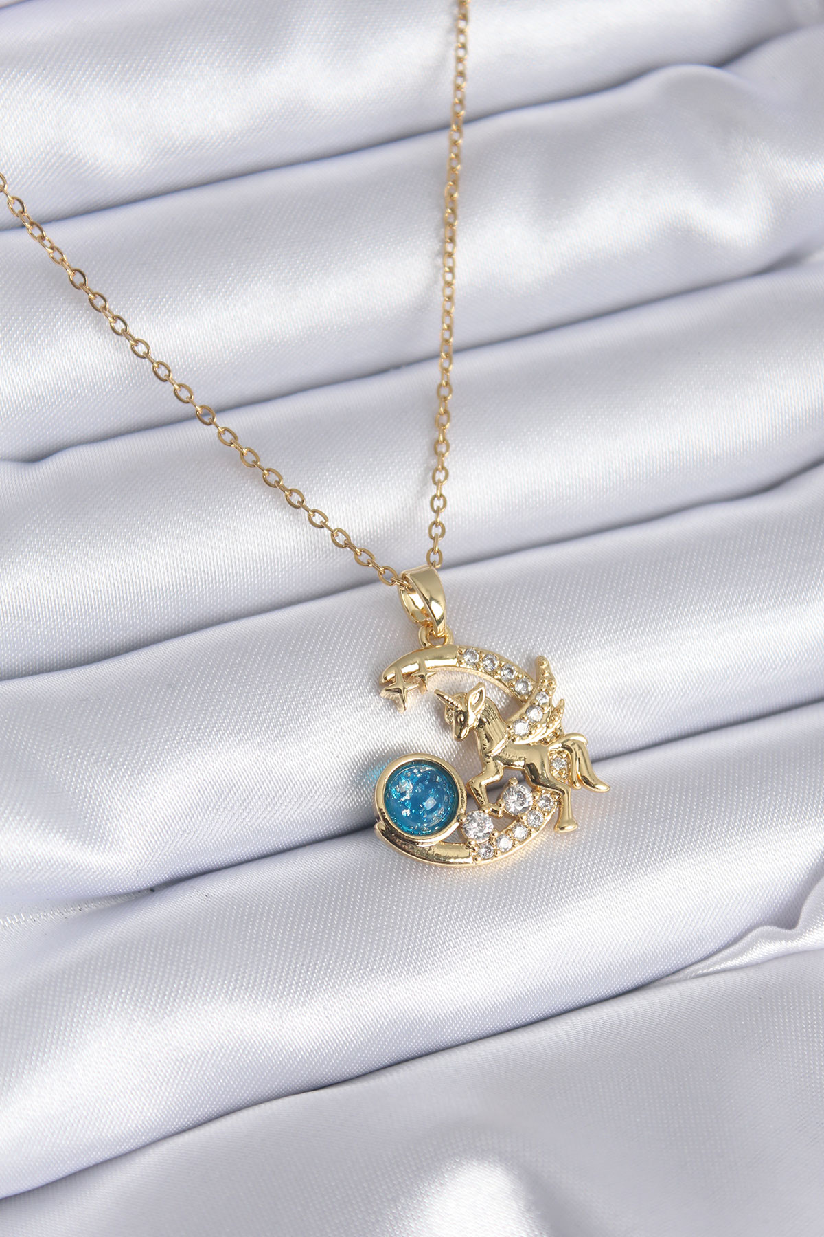 316L Çelik Gold Renk Hilal Ay Tek Boynuzlu At Model Zirkon Taş Detay Kadın Kolye - TJ-BKO7779