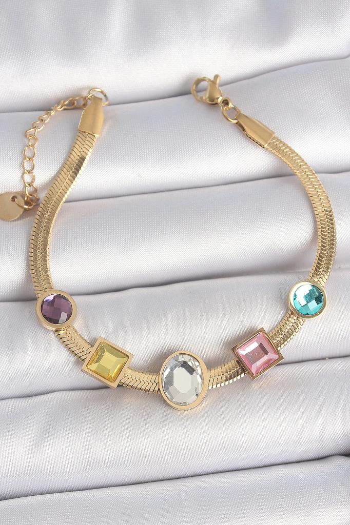 316L Çelik Gold Renk İtalyan Zincir Renkli Zirkon Taşlı Kadın Bileklik - BB6956