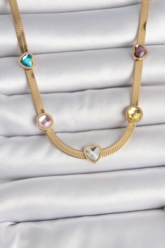 316L Çelik Gold Renk İtalyan Zincir Renkli Zirkon Taşlı Kalp Figür Kadın Kolye - BKO10117