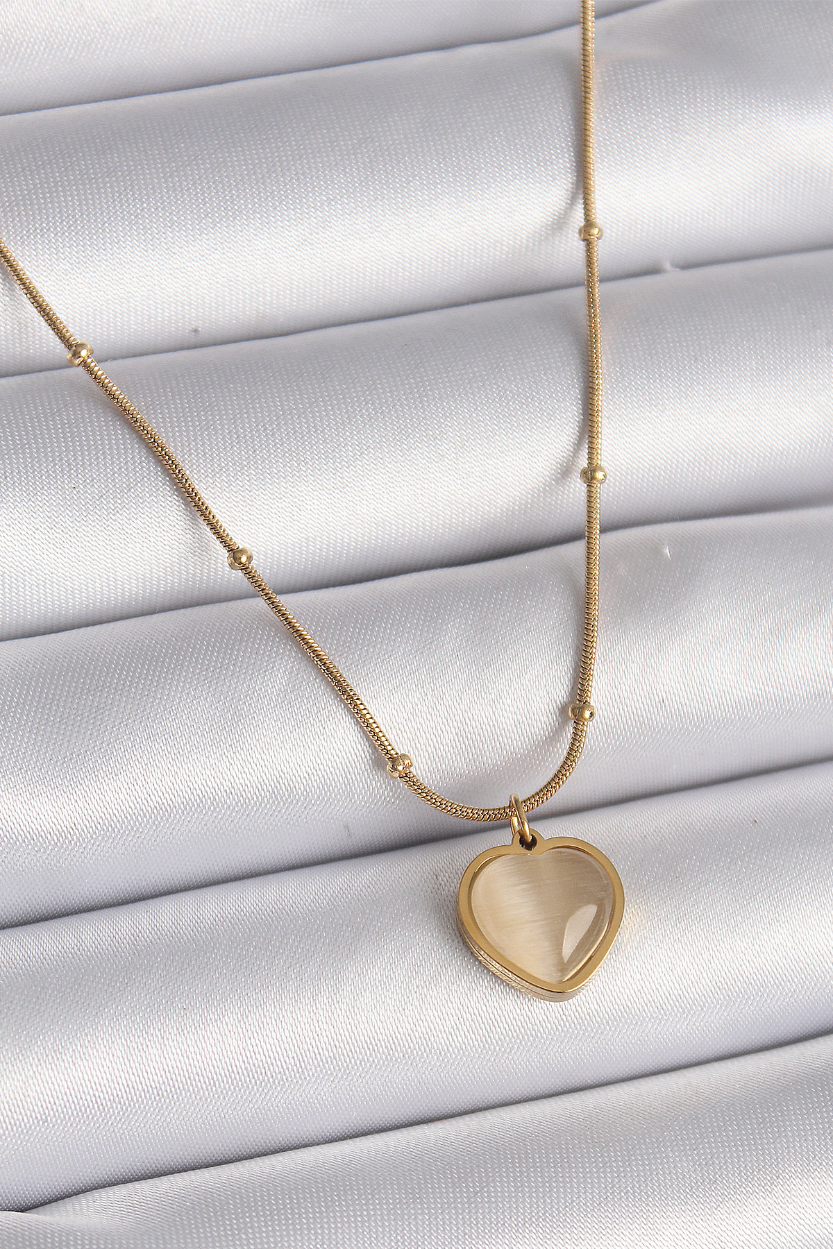 316L Çelik Gold Renk Kedi Gözü Sedefli Kalp Model Kadın Kolye - TJ-BKO9549