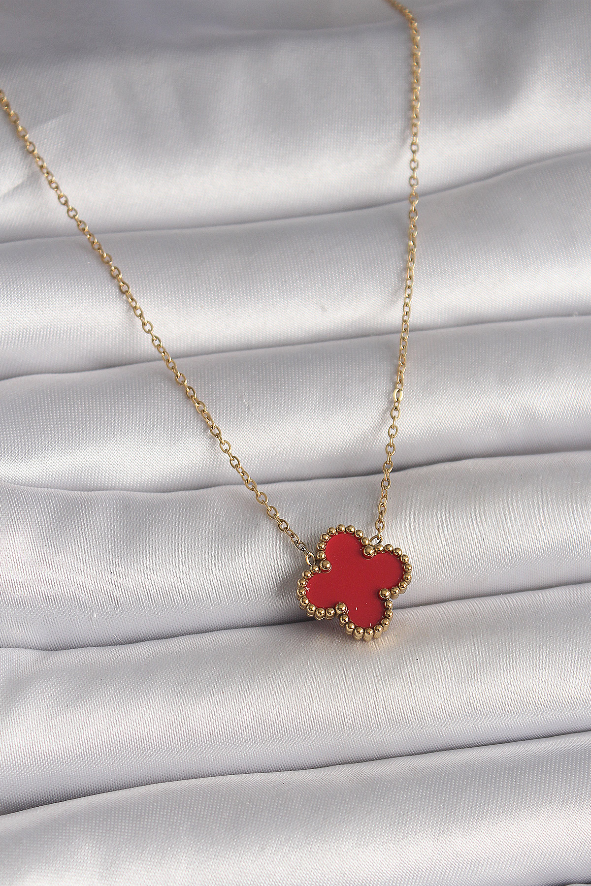 316L Çelik Gold Renk Kırmızı Yonca Model Kadın Kolye - TJ-BKO10015