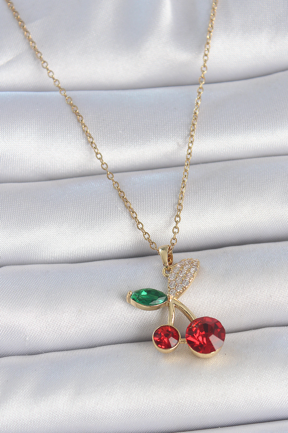 316L Çelik Gold Renk Kırmızı Zirkon Taşlı Kiraz Model Kadın Kolye - TJ-BKO10033