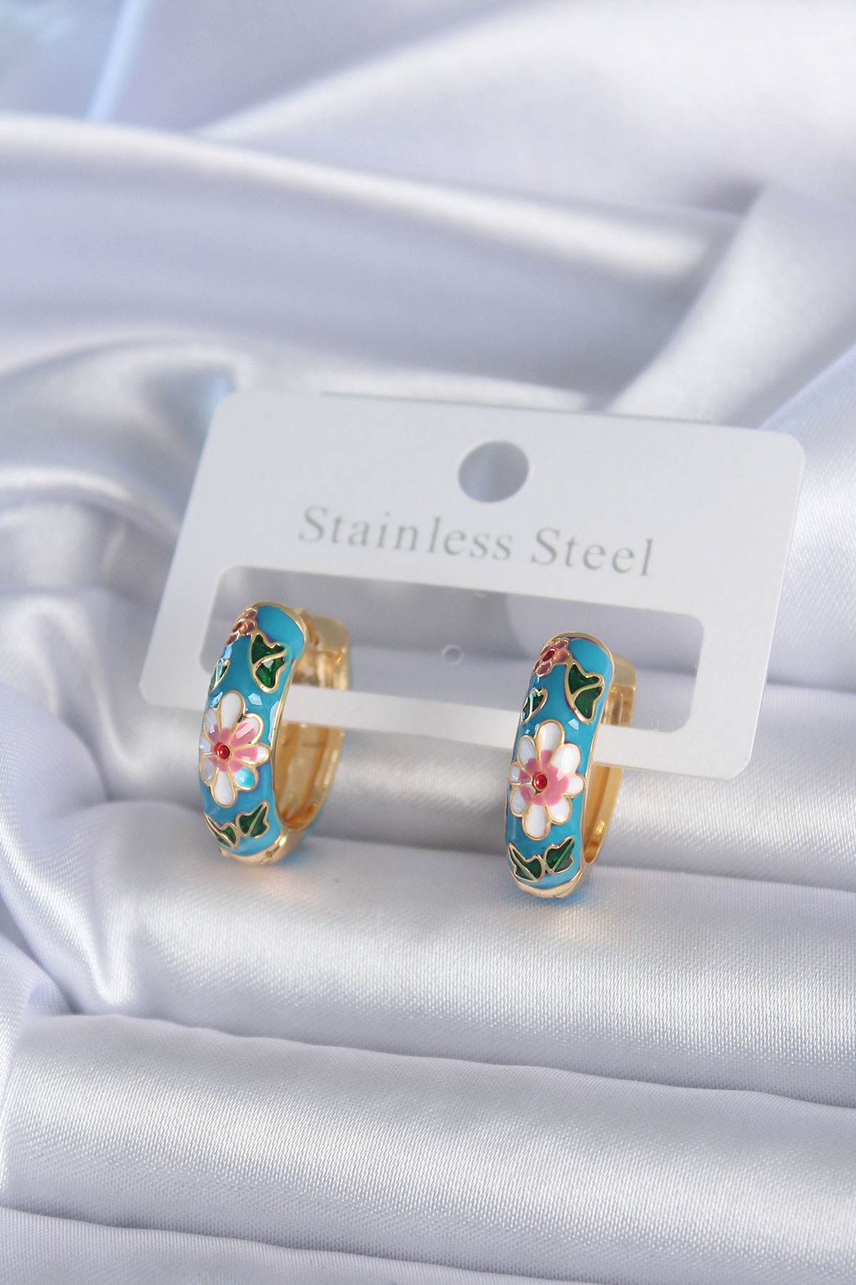 316L Çelik Gold Renk Mavi Çiçek İşleme Detay Kadın Küpe - TJ-BKP7893