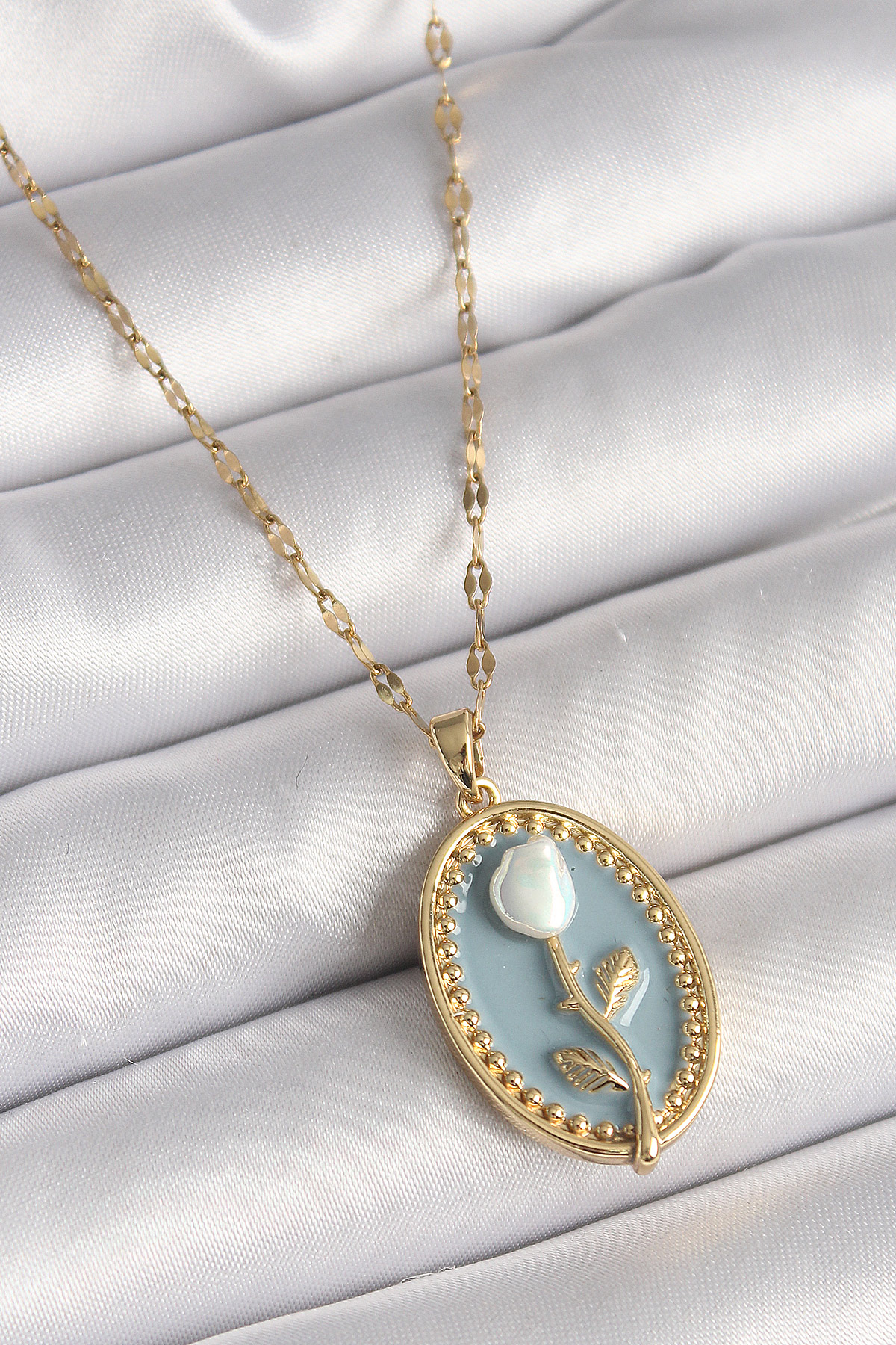 316L Çelik Gold Renk Mavi Oval Portre Model Çiçek İşleme Detay Kadın Kolye - TJ-BKO9883
