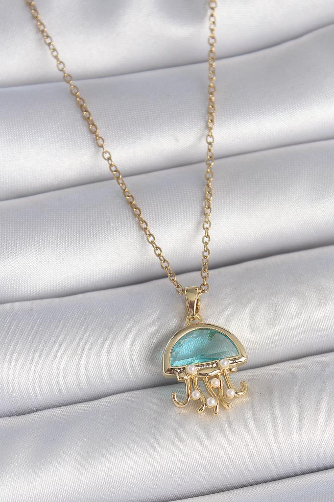 316L Çelik Gold Renk Mavi Taşlı Deniz Anası Model İnci Detay Kadın Kolye - BKO10043