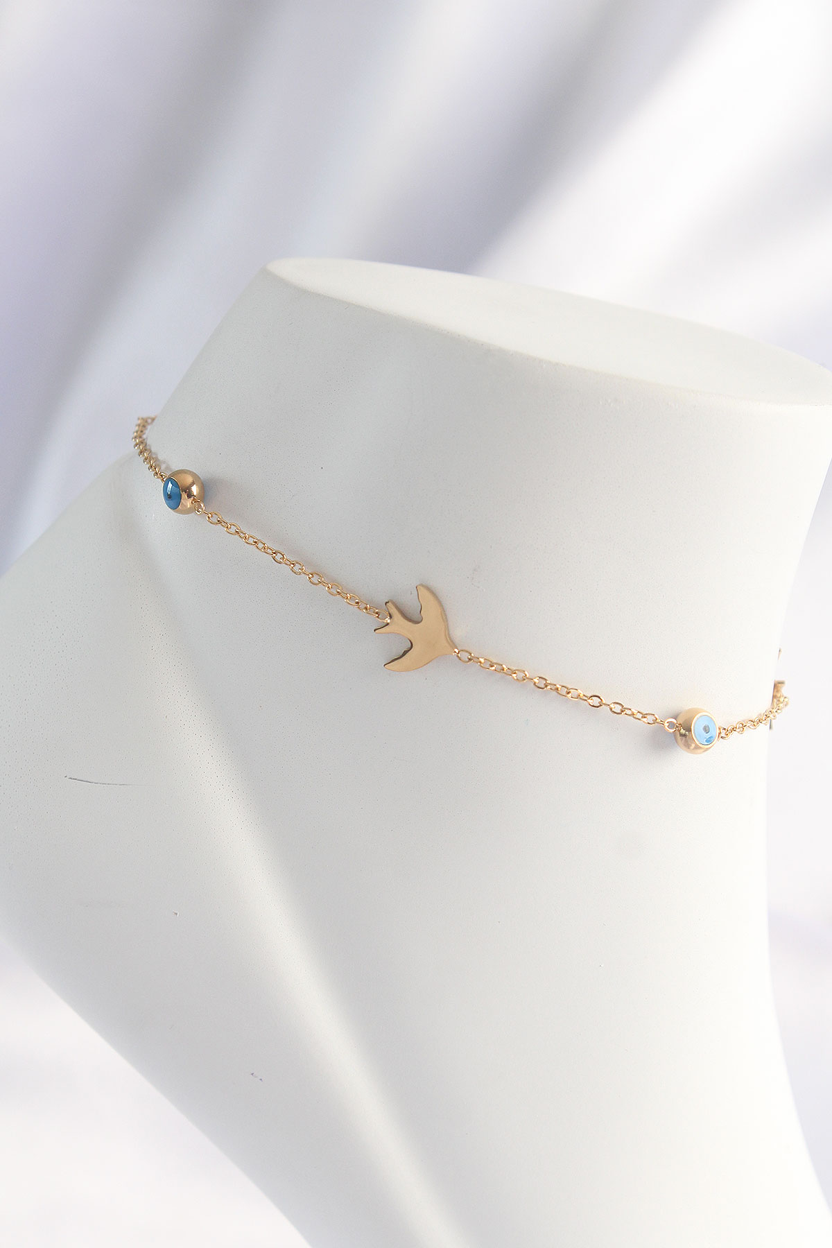 316L Çelik Gold Renk Nazar Boncuk Detay Kuş Tasarımlı Halhal - TJ-HH1616