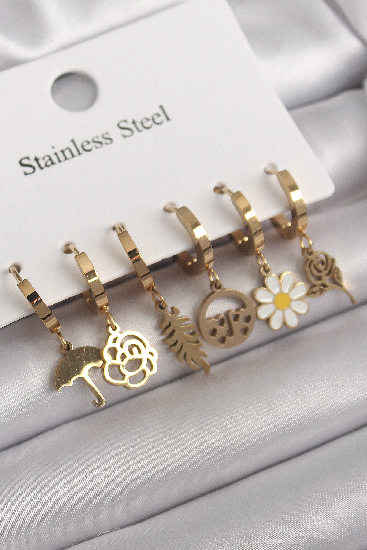 316L Çelik Gold Renk Sallantı Çiçek Model Kadın Küpe Seti - TJ-BKP10266