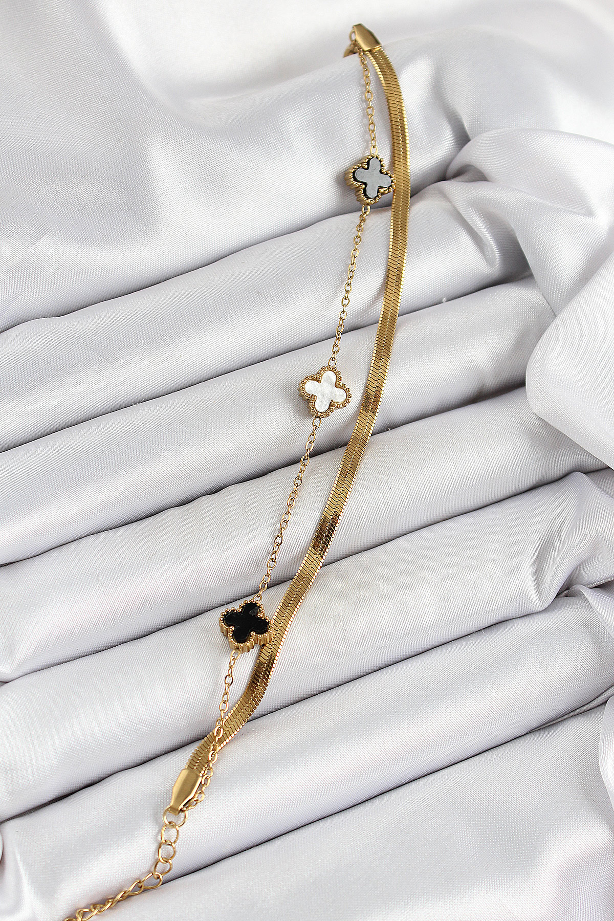 316L Çelik Gold Renk Siyah ve Beyaz Yoncalı İtalyan Zincirli 2'li Kadın Bileklik - TJ-BB7082