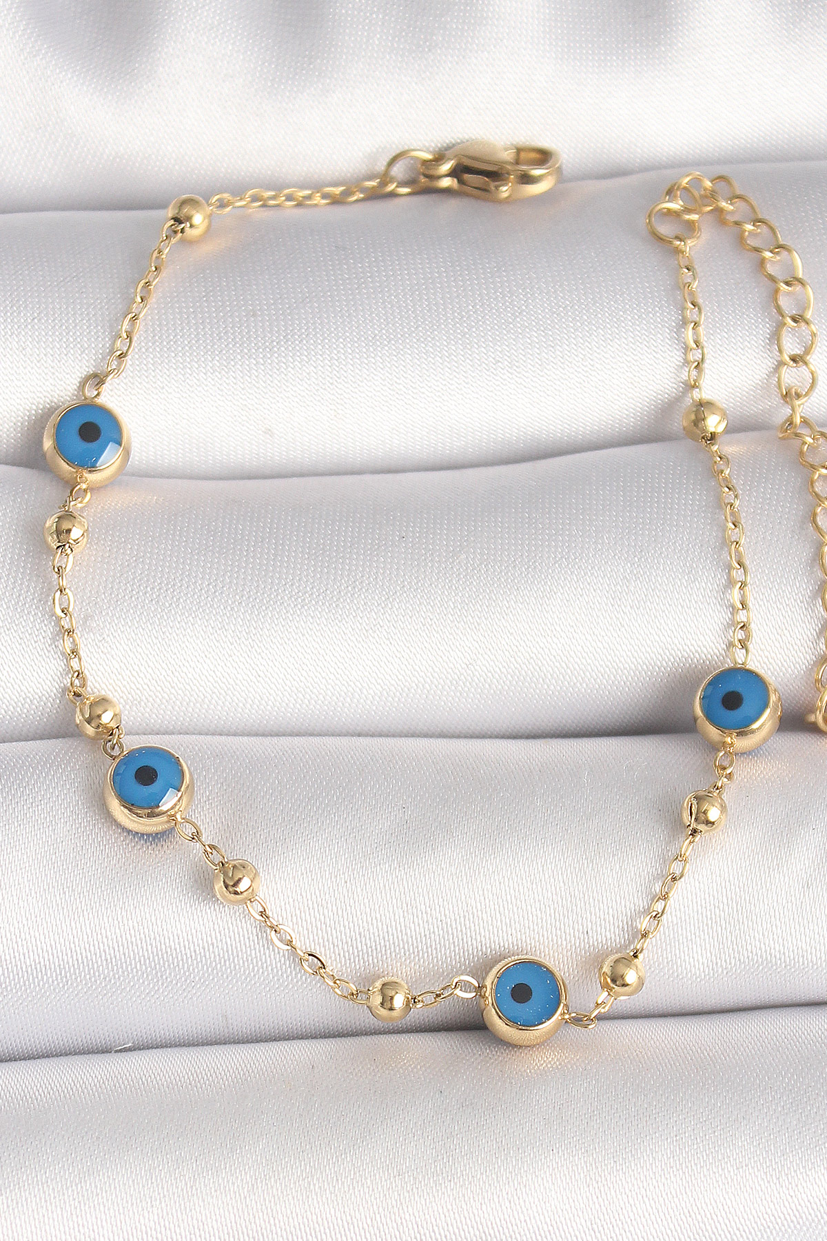 316L Çelik Gold Renk Topçuk Detaylı Zincir Nazar Boncuk Model Kadın Bileklik - TJ-BB6776