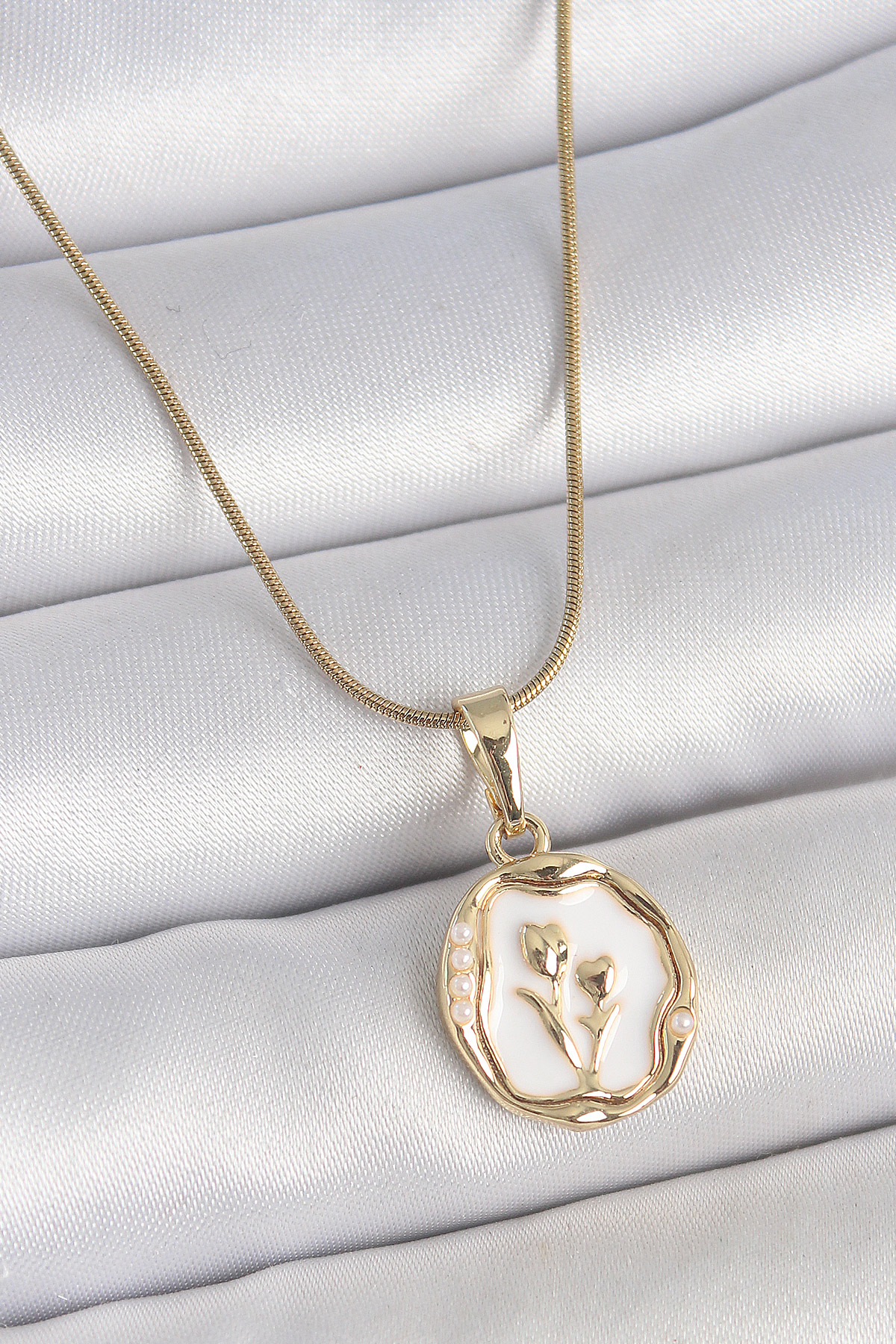 316L Çelik Gold Renk Zincir Beyaz Minel Çiçek İşlemeli Portre Model Kadın Kolye - TJ-BKO10167