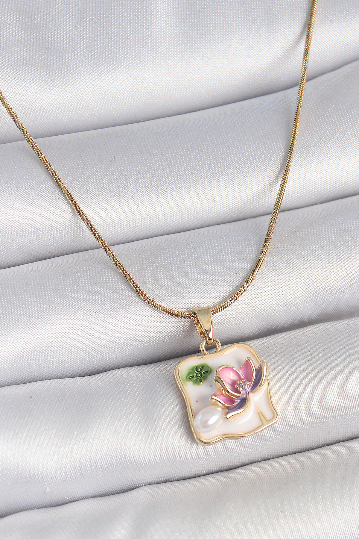316L Çelik Gold Renk Zincir Beyaz Mineli İncili Çiçek İşlemeli Portre Model Kadın Kolye - TJ-BKO10181