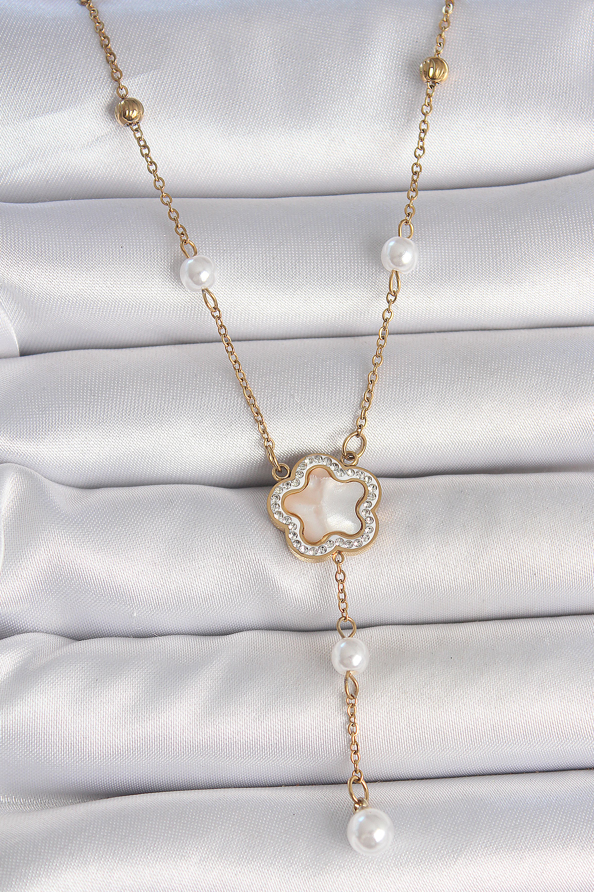 316L Çelik Gold Renk Zincir Beyaz Mineli Zirkon Taşlı Yonca Figür Topçuk Detay Kadın Kolye - TJ-BKO10111