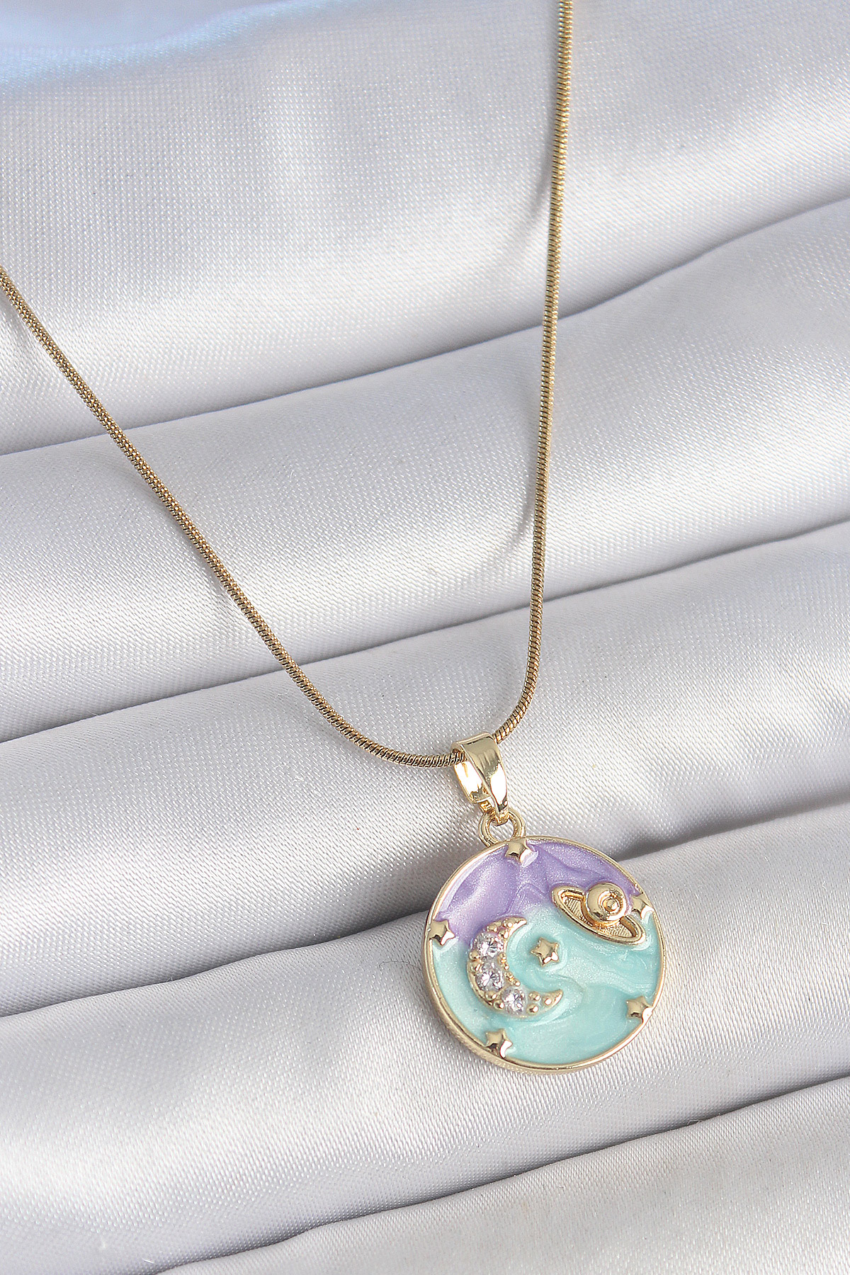 316L Çelik Gold Renk Zincir Çifr Renk Zirkon Taşlı Hilal İşlemeli Yıldız Detay Madalyon Model Kadın Kolye - TJ-BKO10132