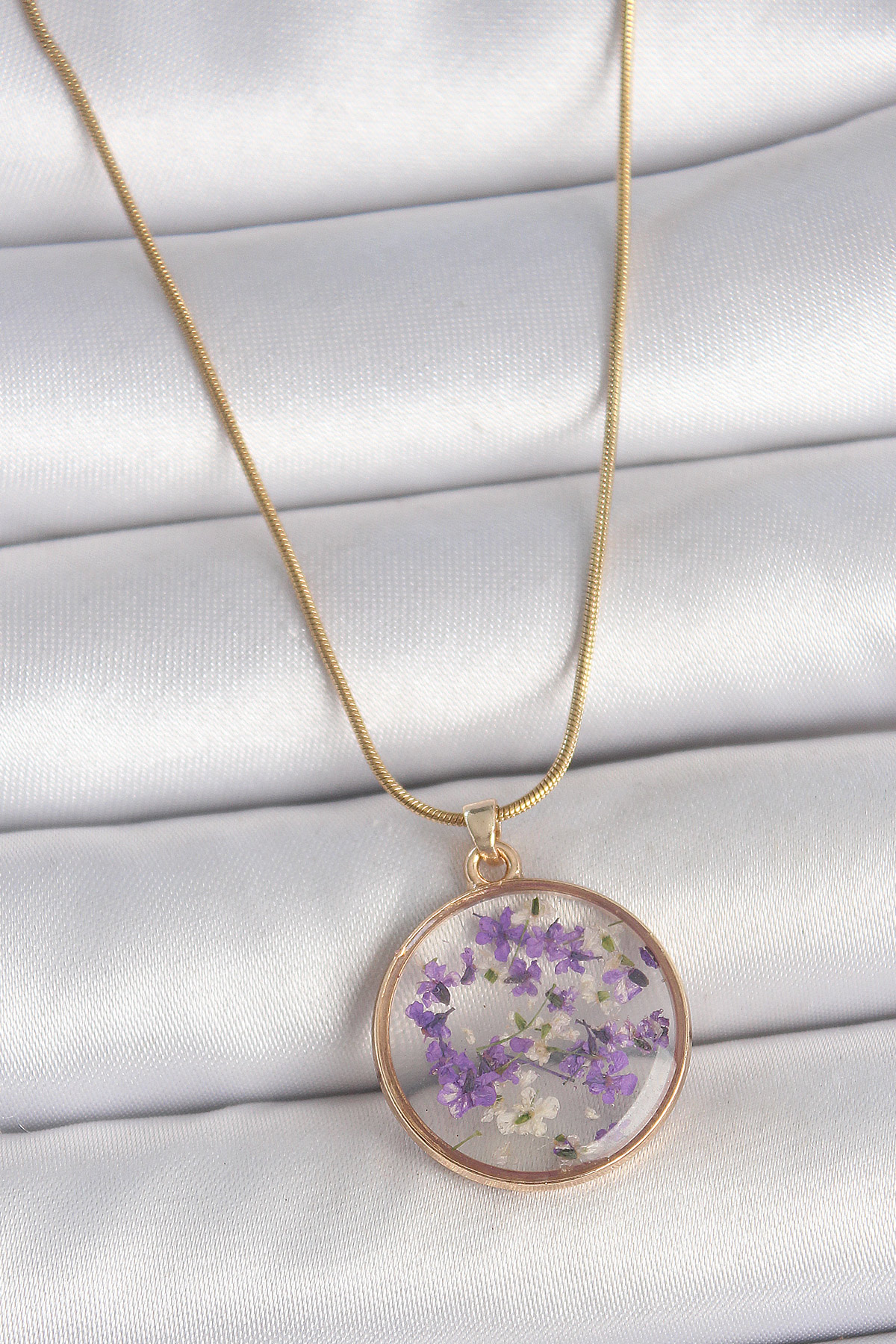 316L Çelik Gold Renk Zincir Daire Eposki Mor Çiçek Model Kadın Kolye - TJ-BKO10071