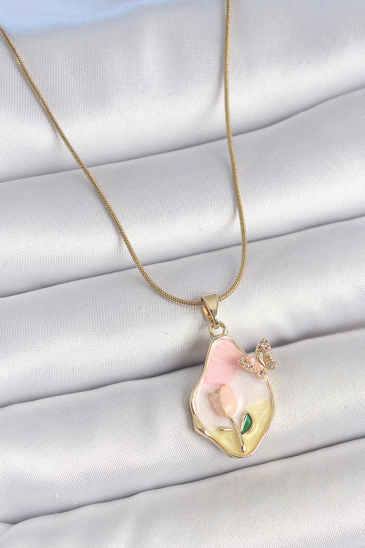 316L Çelik Gold Renk Zincir Damla Mix Renk Çiçek İşlemeli Kelebek Detay Portre Model Kadın Kolye - TJ-BKO10140