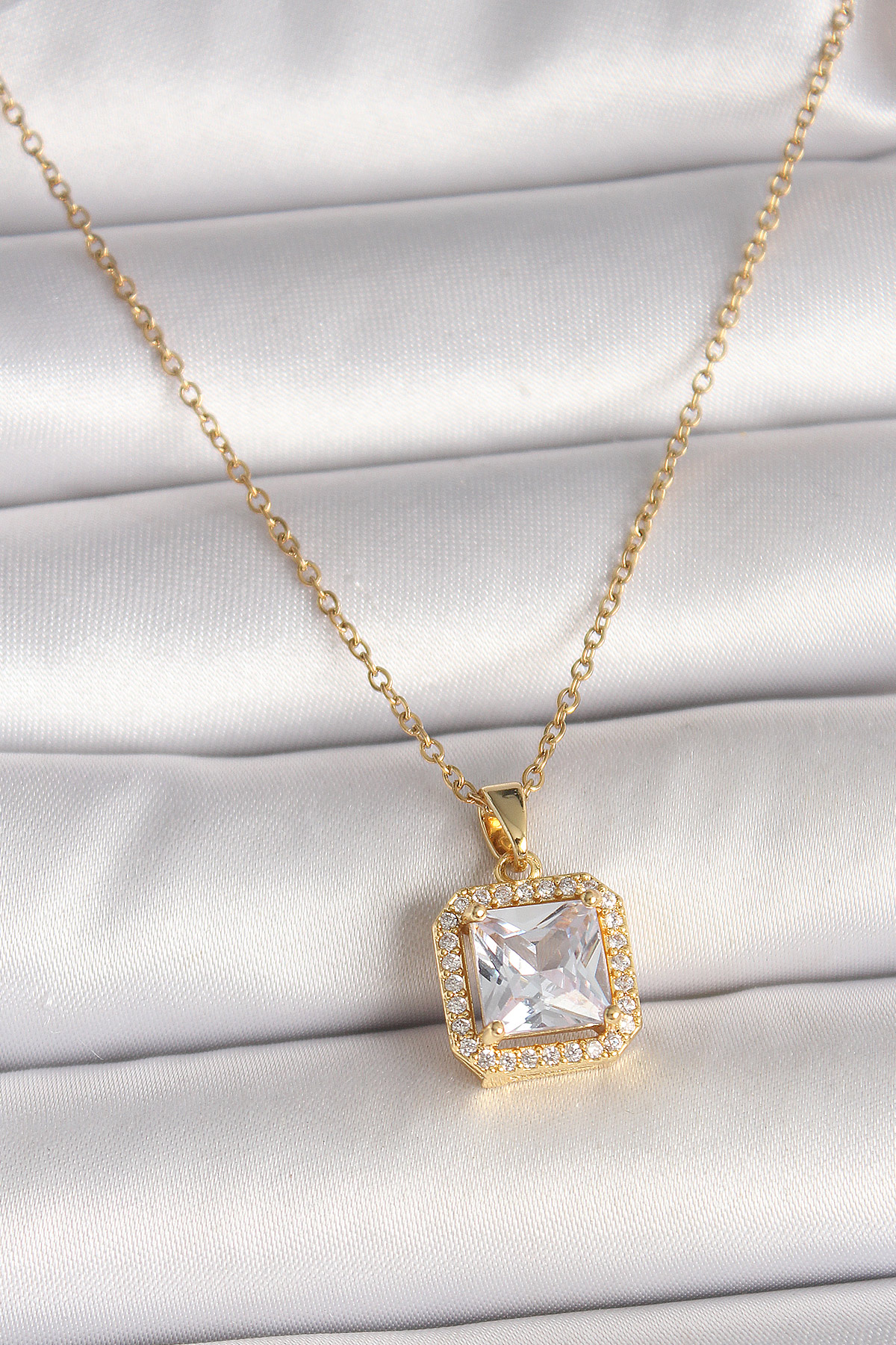 316L Çelik Gold Renk Zincir Kare Zirkon Taşlı Model Kadın Kolye - TJ-BKO9992